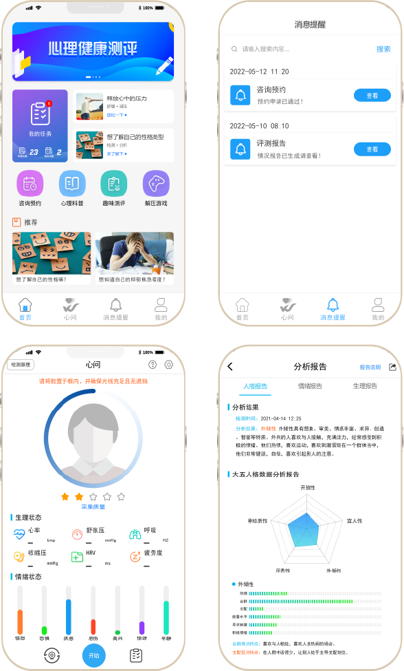 心问APP基于非接触式情感计算技术,借助手机前置相机采集面部信息,仅需30秒即可获得生理及情绪状态结果,并获得完整身心健康报告。心理报告依据大五人格理论,可对学生进行分类,有助于发现和归类不同性格的学生,进而因材施教。同时,也是家长接收孩子进出校时间、体温和情绪报告的终端。此外,也可在心问APP上完成量表任务、进行心理咨询预约、学习心理健康知识等。