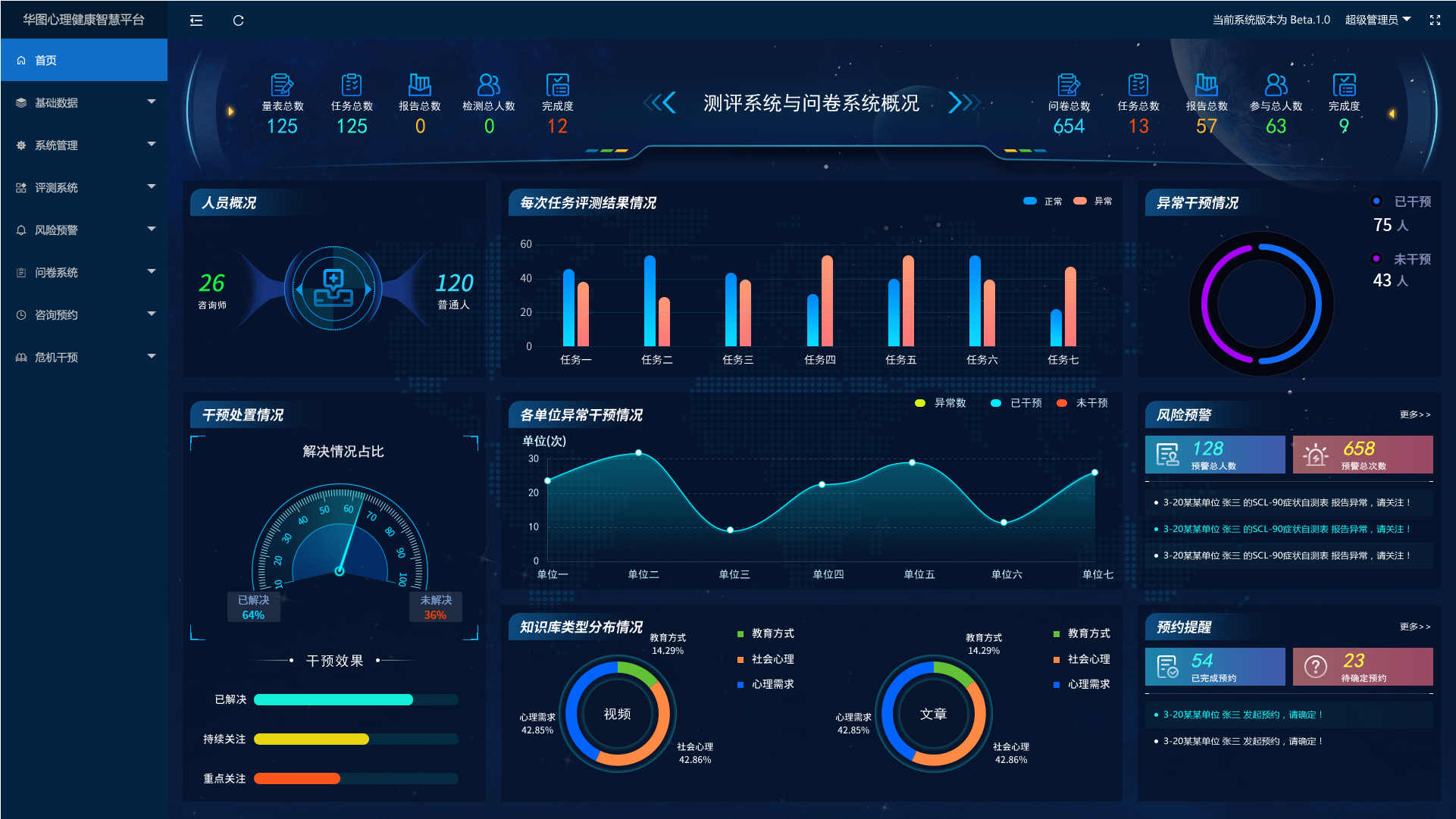 智能心理云平台系统是集发放量表、问卷,自动建立心理档案,进行危机预警、预约咨询,设备和人员管理一体化的系统。系统拥有“一百多个国际通用专业量表和特定量表”,可以提供各项数据概览,包括危机预警统计、预警分布趋势、设备使用情况等,为司法管理者提供全局的数据展示,同时对预警数据进行及时关注。